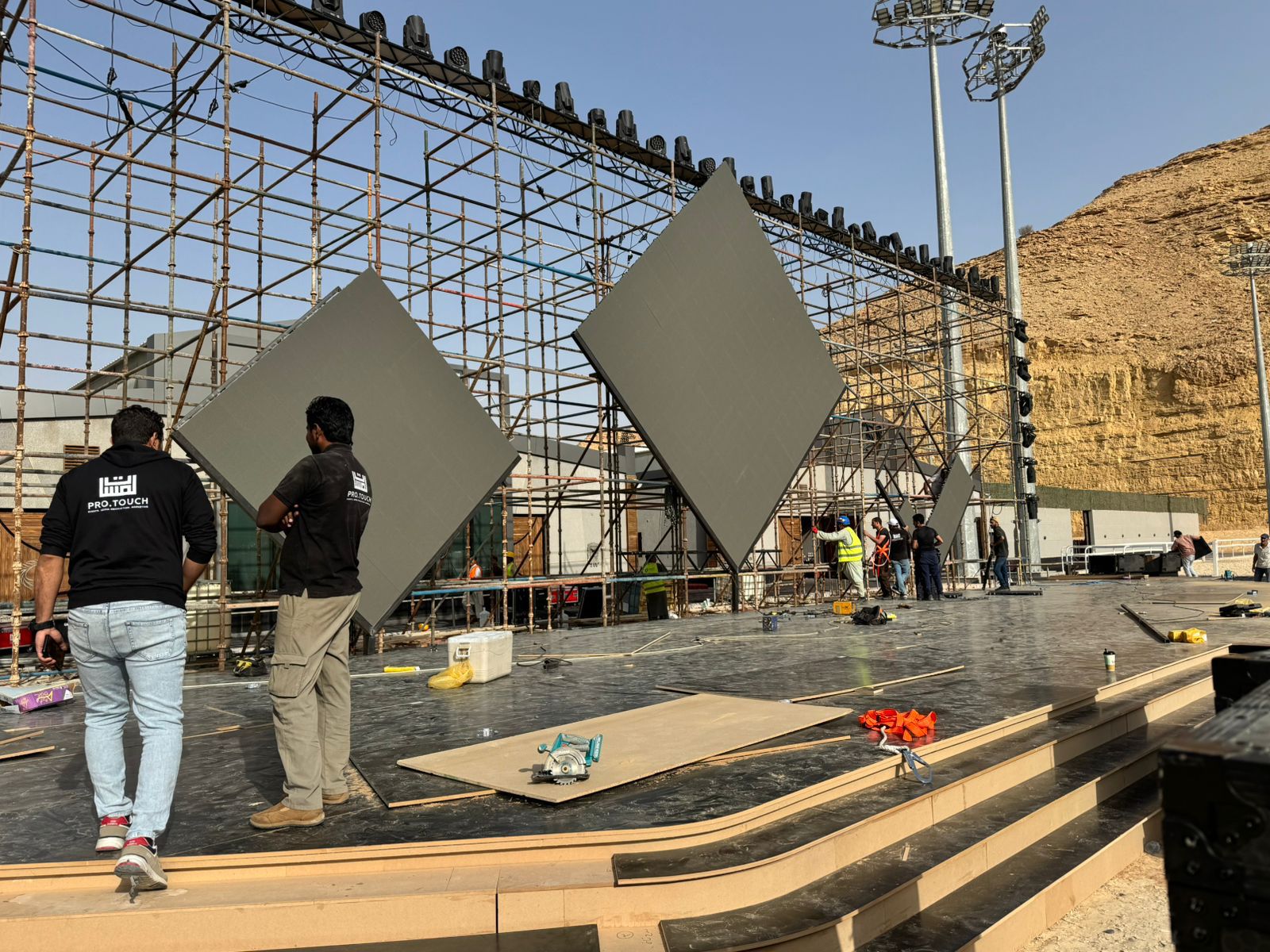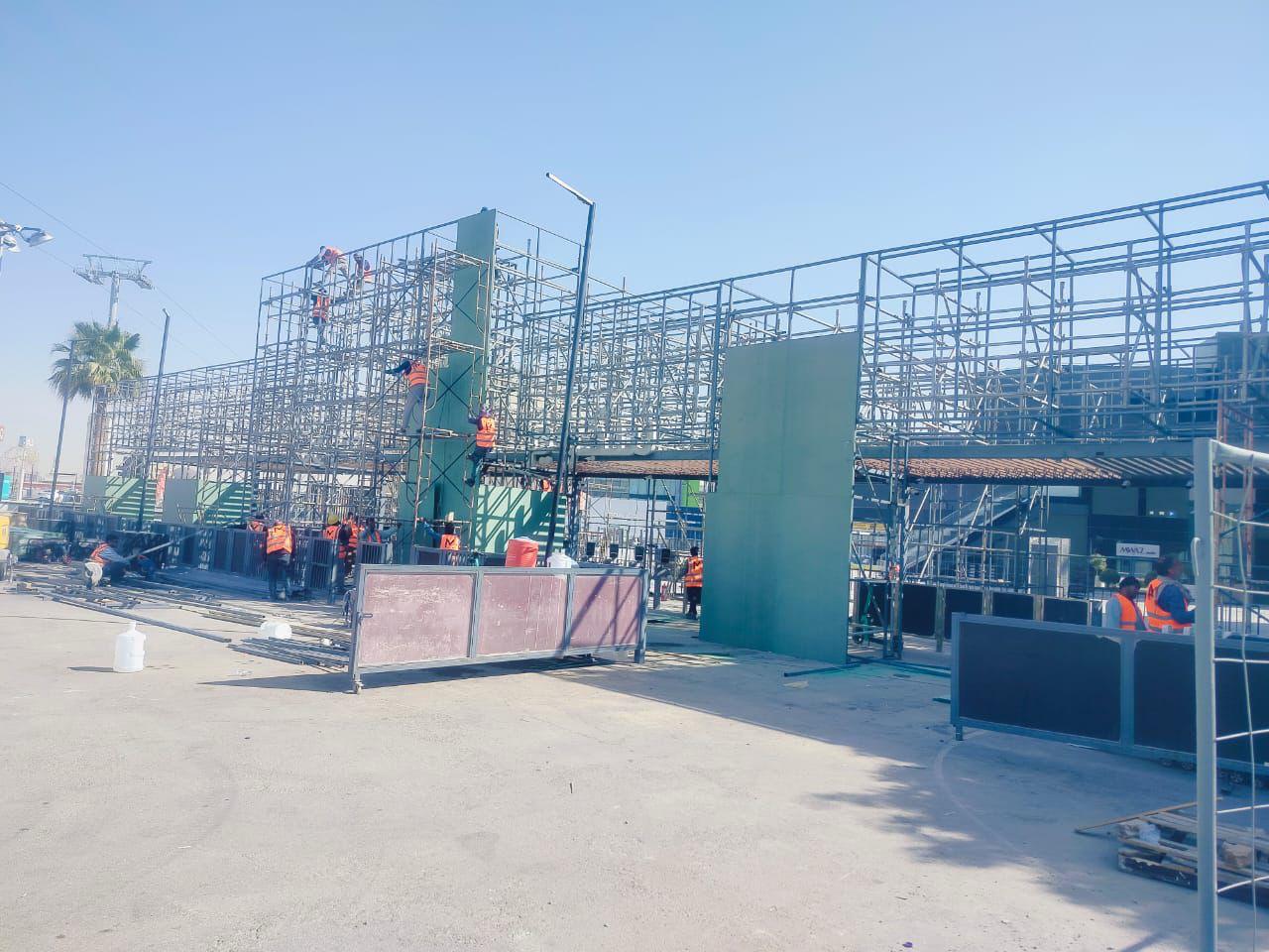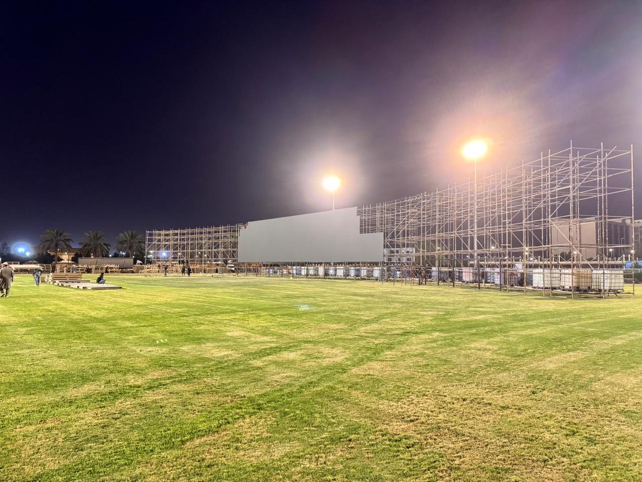 Oplex Builds designed and installed the full temporary structure supporting a large scale LED screen and lighting system at Al Jouf University Stadium. The build included multi level cuplock scaffolding, rear access platforms, and load bearing frames to carry the LED panels and equipment, engineered for stability and safe access throughout the event.